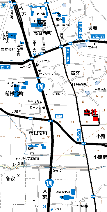 京阪寝屋川市駅orJR東寝屋川駅から京阪バス34番に乗り高宮南口を降りて北東3分